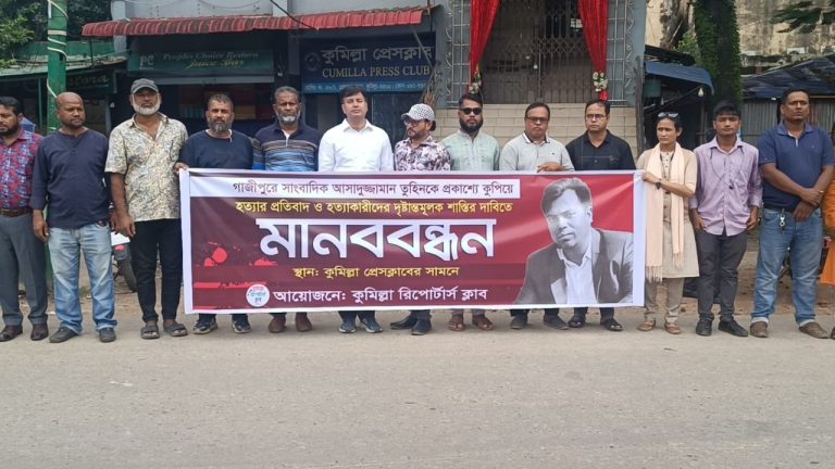 গাজীপুরে সাংবাদিক আসাদুজ্জামান তুহিনকে প্রকাশ্যে কুপিয়ে হত্যার প্রতিবাদ ও হত্যাকারীদের দৃষ্টান্তমূলক শাস্তির দাবিতে কুমিল্লায় মানববন্ধন অনুষ্ঠিত হয়েছে। শনিবার( ৯আগস্ট) দুপুরে কুমিল্লা রিপোর্টার্স ক্লাবের উদ্যোগে প্রেস ক্লাবের সামনে এই মানববন্ধন আয়োজন করা হয়। এ সময় কুমিল্লা প্রেস ক্লাবের সভাপতি কাজী এনামুল হক ফারুক, সাধারণ সম্পাদক জাহিদ হাসান,সাংগঠনিক সম্পাদক ইমতিয়াজ আহমেদ জিতুসহ শতাধিক কর্মরত সাংবাদিকরা মানববন্ধনে অংশ নেন। এছাড়াও বিভিন্ন রাজনৈতিক সামাজিক সংগঠনের নেতৃবৃন্দরা একাত্মতা পোষণ করে মানববন্ধনে বক্তব্য রাখেন।মানববন্ধনে বক্তারা বলেন, সাংবাদিক আসাদুজ্জামান তুহিনকে যারা প্রকাশ্যে কুপিয়ে হত্যা করেছে প্রকৃত অপরাধীদের গ্রেপ্তার করে দ্রুত বিচার নিষ্পত্তি করতে হবে। এছাড়াও স্বাধীনতার পর থেকে সাগর-রুনিসহ যত সাংবাদিক নিহত ও হেনস্তার স্বীকার হয়েছেন তাদের সকল অপরাধীকে বিচারের আওতায় এনে সর্বোচ্চ শাস্তি দিতে সরকারের প্রতি জোর দাবি জানানো হয়।