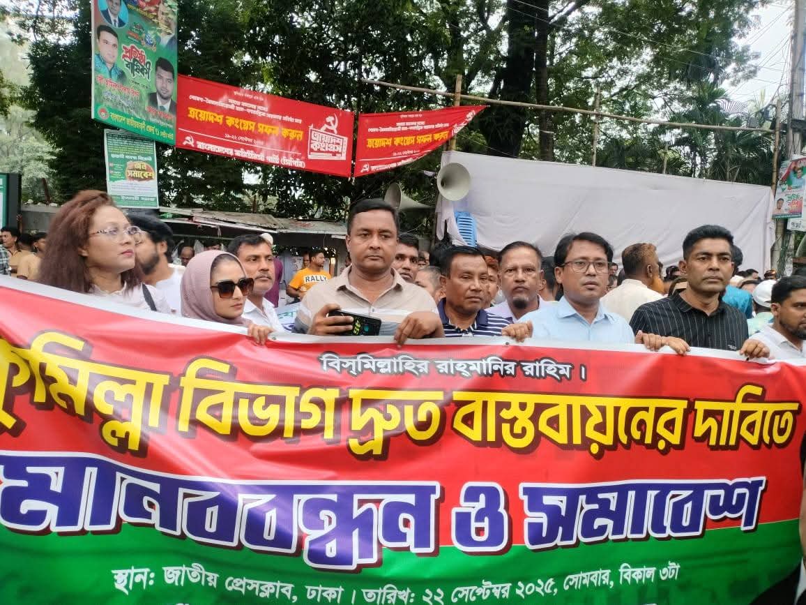 কুমিল্লা নামে বিভাগ বাস্তবায়নের দাবিতে গতকাল (২২ সেপ্টেম্বর)থ সোমবার জাতীয় প্রেস ক্লাবের সামনে এক বিশাল মানববন্ধন ও সমাবেশ অনুষ্ঠিত হয়েছে। এতে কুমিল্লার সকল উপজেলাসহ ঢাকায় বসবাসরত কুমিল্লা জেলার বিপুল সংখ্যক নাগরিক অংশ নেন। বিভিন্ন উপজেলার নামে ব্যানারে ব্যানারে মিছিলে মিছিলে মুখরিত, ‘দাবি নয়, অধিকার, কুমিল্লা নামে কুমিল্লা বিভাগ চাই’—এই স্লোগানকে সামনে রেখে অনুষ্ঠিত এই সমাবেশে সভাপতিত্ব করেন ঢাকাস্থ কুমিল্লা সমিতির সভাপতি এ বি এম শাহজাহান। এতে প্রধান অতিথি হিসেবে উপস্থিত ছিলেন সাবেক মন্ত্রী ও বিএনপি’র জাতীয় স্থায়ী কমিটির সিনিয়র সদস্য,বীর মুক্তি যোদ্ধা ড. খন্দকার মোশারফ হোসেন। বিশেষ অতিথি হিসেবে আরও উপস্থিত ছিলেন, দক্ষিণাঞ্চলের মুখ্য সংগঠক (এনসিপি) দক্ষিণাঞ্চলের মুখ্য সংগঠক হাসনাত আব্দুল্লাহ, কুমিল্লা নাগরিক পরিষদের আহ্বায়ক ড. শাহ মোহাম্মদ সেলিম, কেন্দ্রীয় যুগ্ম মুখ্য সমন্বয়ক,জাতীয় নাগরিক কমিটি,নাভিদ নওরোজ শাহ, যুগ্ম সদস্য সচিব, নাগরিক পরিষদ কুমিল্লা, মিয়া মোঃ তৌফিক।