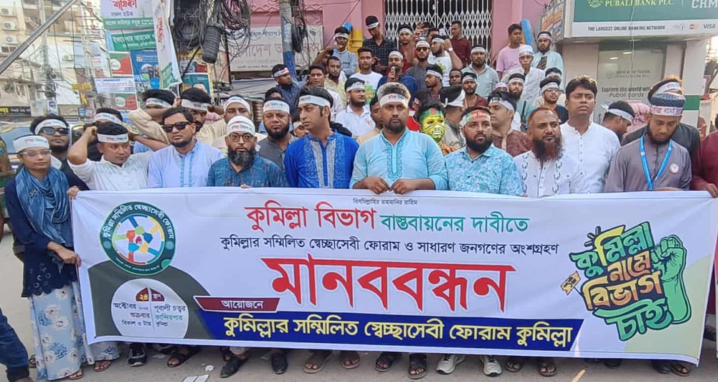 কুমিল্লায় বিভাগ বাস্তবায়নের দাবিতে সম্মিলিত স্বেচ্ছাসেবী ফোরামের মানববন্ধন ও সমাবেশ