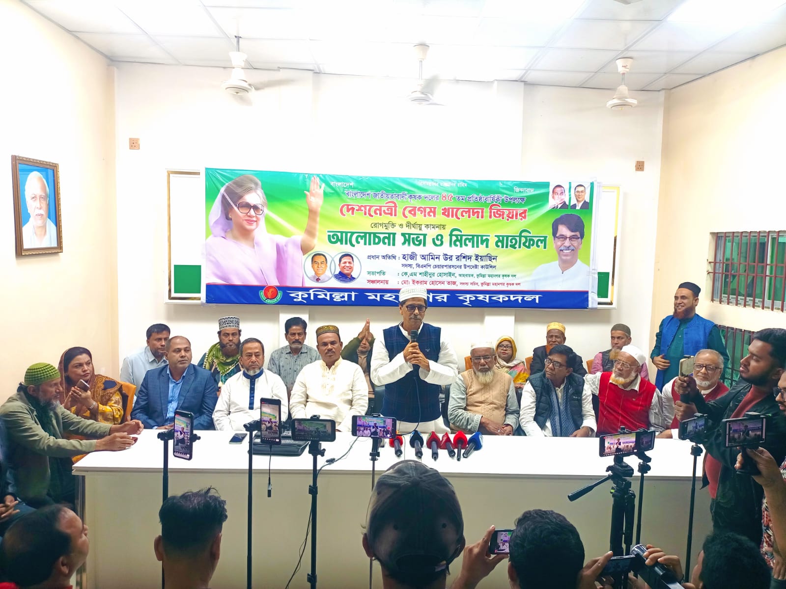 বাংলাদেশ জাতীয়তাবাদী কৃষকদলের প্রতিষ্ঠাবার্ষিকী উপলক্ষে আলোচনা সভা ও দোয়া মাহফিল অনুষ্ঠিত হয়েছে।অনুষ্ঠানে দলের নেতা-কর্মীরা জাতীয়তাবাদী কৃষকদলের নীতিমালা, সংগঠনের অগ্রগতি এবং কৃষকদের অধিকার আদায়ে ভবিষ্যৎ করণীয় বিষয়ে আলোচনা করেন।অনুষ্ঠানে প্রধান অতিথি হিসেবে উপস্থিত ছিলেন সাবেক সংসদ সদস্য এবং বিএনপি চেয়ারপার্সনের উপদেষ্টা কাউন্সিলের সদস্য হাজী আমিন উর রশিদ ইয়াছিন। তিনি বলেন, কৃষকদল দেশের কৃষকদের ন্যায্য অধিকার নিশ্চিত করতে গুরুত্বপূর্ণ ভূমিকা রেখে আসছে। তিনি নেতাকর্মীদের আরও ঐক্যবদ্ধভাবে কাজ করার আহ্বান জানান।অনুষ্ঠানে সভাপতিত্ব করেন কুমিল্লা মহানগর কৃষকদলের আহ্বায়ক কাজী শাহিনুর হোসাইন। তিনি বলেন, কৃষকদের অধিকার প্রতিষ্ঠায় কৃষকদলের ভূমিকা সবসময়ই অগ্রগণ্য।সঞ্চালনা করেন কুমিল্লা মহানগর কৃষকদলের সদস্য সচিব ইকরাম হোসেন তাজ।অনুষ্ঠানে সাবেক প্রধানমন্ত্রী ও বিএনপি চেয়ারপার্সন দেশনেত্রী বেগম খালেদা জিয়া-এর দ্রুত সুস্থতা ও রোগমুক্তি কামনায় বিশেষ দোয়া করা হয়। এতে কৃষকদলসহ বিএনপির অঙ্গ ও সহযোগী সংগঠনের নেতাকর্মীরা অংশ নেন।