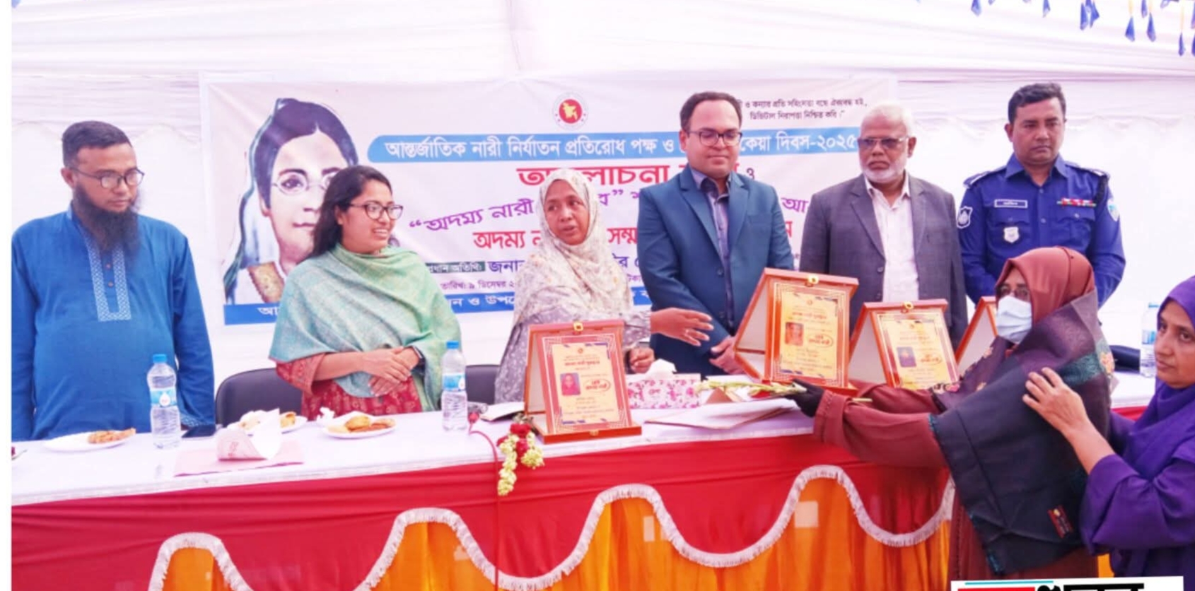 কুমিল্লার বুড়িচংয়ে আন্তর্জাতিক নারী নির্যাতন প্রতিরোধ পক্ষ ও বেগম রোকেয়া দিবস উপলক্ষে আলোচনা সভা ও অদম্য নারীদের সম্মাননা প্রদান অনুষ্ঠান অনুষ্ঠিত হয়েছে। মঙ্গলবার (৯ ডিসেম্বর) সকাল ১১টায় উপজেলা প্রশাসন ও উপজেলা মহিলা বিষয়ক কার্যালয়ের উদ্যোগে এ অনুষ্ঠান আয়োজন করা হয়।উপজেলা মহিলা বিষয়ক কর্মকর্তা ফাতেমা জোহরার সভাপতিত্বে অনুষ্ঠিত আলোচনা সভায় প্রধান অতিথির বক্তব্য রাখেন উপজেলা নির্বাহী অফিসার মো. তানভীর হোসেন।সভায় আরও বক্তব্য রাখেন উপজেলা কৃষি অফিসার আফরিনা আক্তার, বুড়িচং প্রেসক্লাবের সভাপতি কাজী খোরশেদ আলম, নারী জয়িতা ফরিদা ইয়াসমিন ও শারমিন আক্তার।অনুষ্ঠানে উপস্থিত ছিলেন— বুড়িচং থানার সেকেন্ড অফিসার এসআই মো. রাকিবুল হাসান, উপজেলা মাধ্যমিক শিক্ষা অফিসার মো. কবির আহমেদ, উপজেলা প্রাথমিক শিক্ষা অফিসার ফওজিয়া আক্তার, নির্বাচন অফিসার মো. হুমায়ুন কবির, সমাজসেবা কর্মকর্তা মো. আবদুল মান্নান, পারোয়ারা আবদুল মতিন খসরু কলেজের অধ্যক্ষ আবু ইউসুফ ভূঁইয়া, লড়িবাগ উচ্চ বিদ্যালয়ের প্রধান শিক্ষক জামসেদ আলম, উপজেলা কমপ্লেক্স জামে মসজিদের ইমাম মুফতি আবু মুসা, সাবেক উপজেলা প্রশাসনিক কর্মকর্তা সুলতান আহমেদ, বুড়িচং আনন্দ পাইলট সরকারি উচ্চ বিদ্যালয়ের শিক্ষক মো. ইসমাইল হোসেনসহ বিভিন্ন দপ্তরের কর্মকর্তা ও বিভিন্ন শ্রেণি–পেশার মানুষ। আলোচনা শেষে অদম্য নারীদের সম্মাননা প্রদান করা হয়।