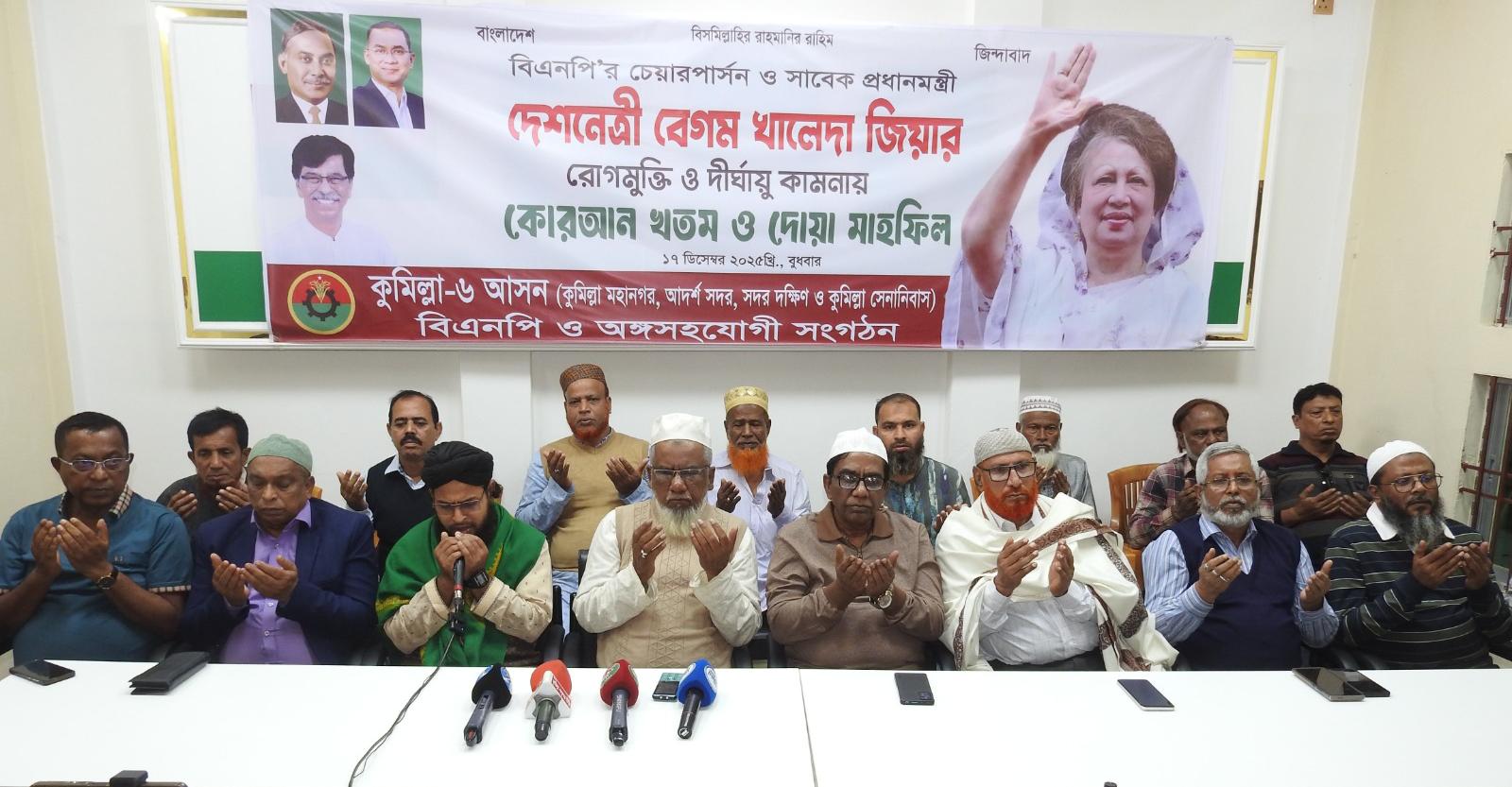 বিএনপি চেয়ারপার্সন ও সাবেক প্রধানমন্ত্রী বেগম খালেদা জিয়ার দ্রুত আরোগ্য ও সুস্বাস্থ্য কামনায় কুমিল্লায় ধারাবাহিকভাবে কুরআন খতম ও বিশেষ দোয়া-মাহফিল অনুষ্ঠিত হচ্ছে।কুমিল্লা–৬ আসনের জননেতা ও বিএনপি চেয়ারপার্সনের উপদেষ্টা হাজী আমিন উর রশিদ ইয়াছিনের উদ্যোগে নগরী ও জেলার বিভিন্ন মসজিদে নিয়মিতভাবে কুরআন খতম, দোয়া-মাহফিল, এতিমখানায় খাবার বিতরণ এবং পশু সদকার কর্মসূচি পালন করা হচ্ছে।এরই অংশ হিসেবে বুধবার (১৭ ডিসেম্বর) বিকেলে নগরীর কান্দিরপাড় এলাকায় কুরআন খতম শেষে বিশেষ দোয়া-মাহফিল অনুষ্ঠিত হয়। দোয়া অনুষ্ঠানে বেগম খালেদা জিয়ার সুস্থতা ও দীর্ঘায়ু কামনার পাশাপাশি দেশ ও জাতির কল্যাণ, শান্তি ও সমৃদ্ধি কামনা করা হয়।
