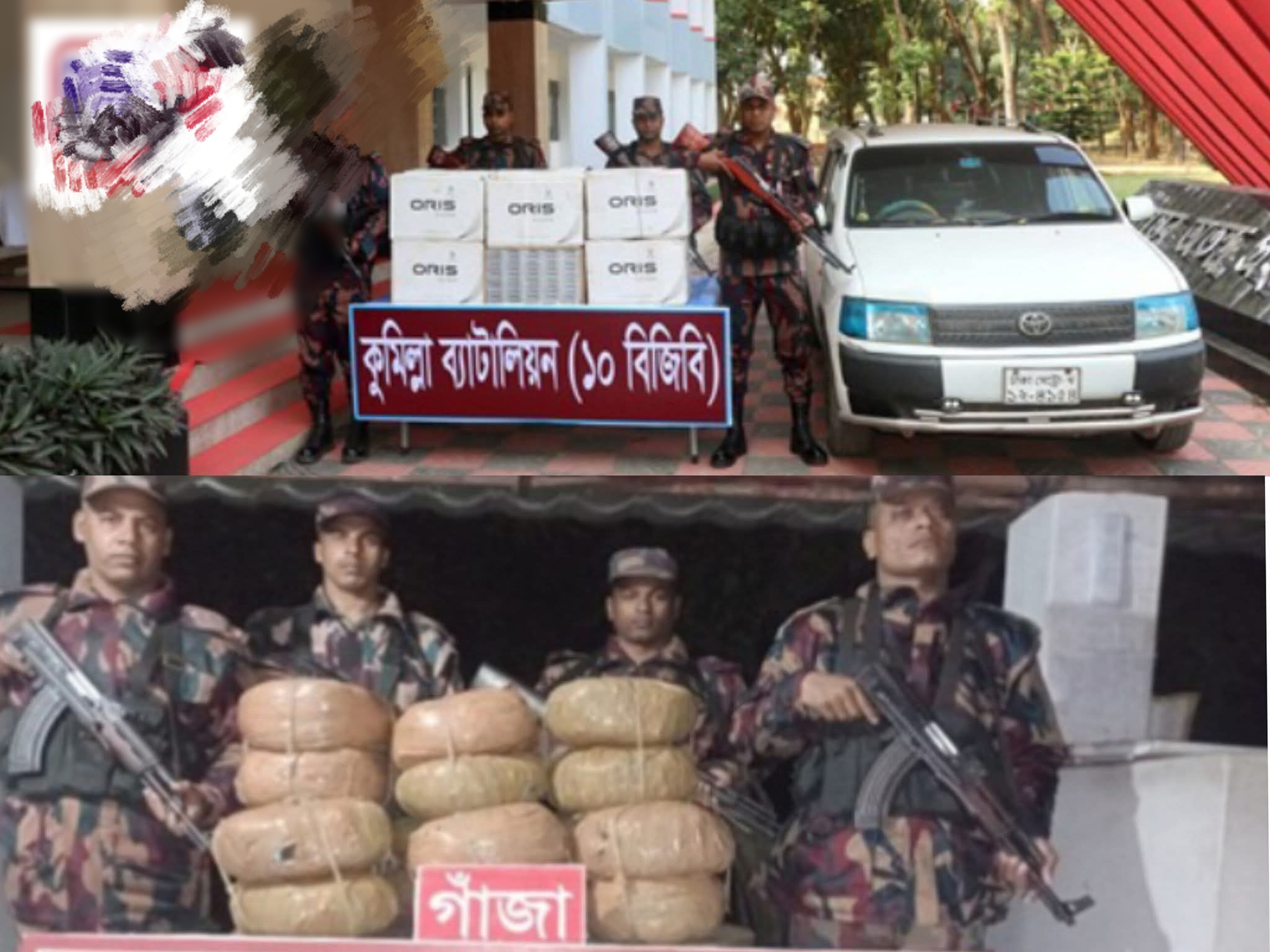 কুমিল্লা জেলার সীমান্ত এলাকা হতে কুমিল্লা ব্যাটালিয়ন (১০ বিজিবি) কর্তৃক ০১ (এক) জন আসামীসহ সর্বমোট ৪৪,১১,৫৯৫/- (চুয়াল্লিশ লক্ষ এগারো হাজার পাঁচশত পঁচানব্বই) টাকা মূল্যের মাদক ও অবৈধ ভারতীয় সিগারেট আটক করা হয়েছে।কুমিল্লা ব্যাটালিয়ন (১০ বিজিবি) নিজস্ব দায়িত্বপূর্ণ সীমান্ত এলাকায় চোরাচালান প্রতিরোধসহ আন্তঃসীমান্ত অপরাধ দমনে নিয়মিত অভিযান পরিচালনা করে থাকে।আজ,২০ ডিসেম্বর ২০২৫ তারিখে কুমিল্লা জেলার সদর দক্ষিণ উপজেলাধীন যশপুর বিওপি’র আওতাধীন লক্ষীপুর পোস্ট ও আদর্শ সদর উপজেলাধীন বিবিরবাজার বিওপি’র আওতাধীন কটকবাজার পোস্টের বিশেষ টহলদল সীমান্ত এলাকায় মাদক ও চোরাচালান বিরোধী পৃথক পৃথক অভিযান পরিচালনা করে।বিজিবি জানায়,উক্ত অভিযানে সীমান্তের ০৮ কিঃ মিঃ এর মধ্যে বাংলাদেশের অভ্যন্তরে যথাক্রমে পদ্দারখীল এবং চাঁনপুর বালুর মাঠ নামক স্থান হতে বিজিবি টহল দল কর্তৃক ০১ (এক) জন আসামীসহ অবৈধ বিভিন্ন প্রকার মাদক ও ভারতীয় সিগারেট আটক করে। যার সর্বমোট মূল্য ৪৪,১১,৫৯৫/- (চুয়াল্লিশ লক্ষ এগারো হাজার পাঁচশত পঁচানব্বই) টাকা।বিজিবি আরও জানায়,জব্দকৃত মালামাল বিধি মোতাবেক কাস্টমস এ জমা করা হবে।