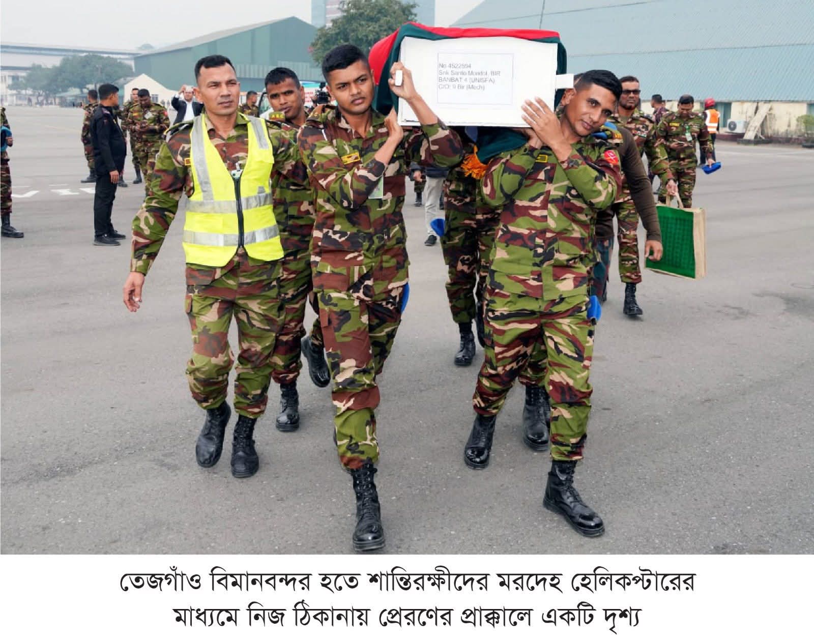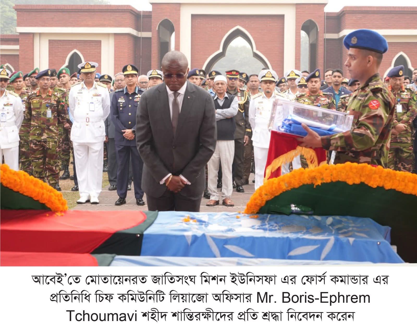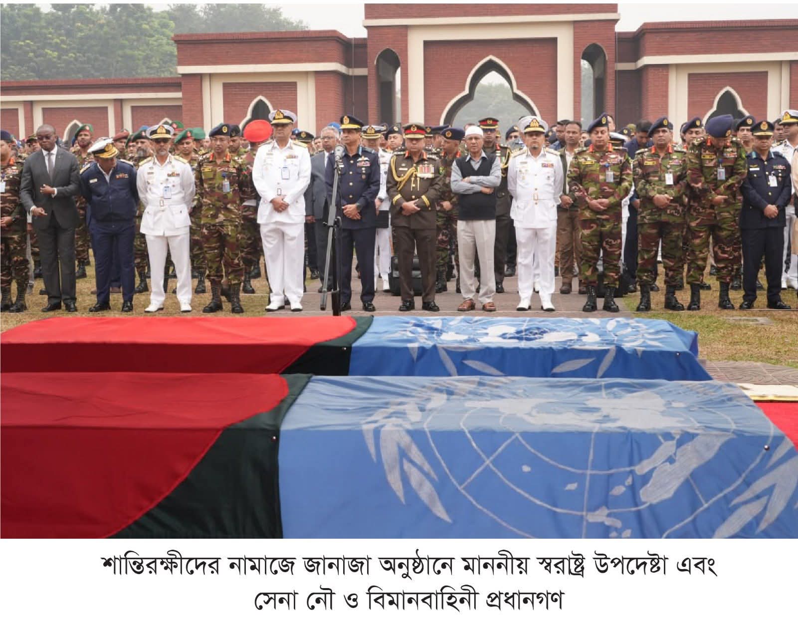 নামাজে জানাযায় মাননীয় স্বরাষ্ট্র উপদেষ্টা লেফটেন্যান্ট জেনারেল জাহাঙ্গীর আলম চৌধুরী (অবঃ), সেনাবাহিনী প্রধান জেনারেল ওয়াকার-উজ-জামান, এসবিপি, ওএসপি, এসজিপি, পিএসসি; নৌবাহিনী প্রধান এডমিরাল এম নাজমুল হাসান, ওএসপি, এনপিপি, এনডিসি, এনসিসি, পিএসসি; বিমান বাহিনী প্রধান এয়ার চীফ মার্শাল হাসান মাহমুদ খাঁন, বিবিপি, ওএসপি, জিইউপি, এনএসডব্লিউসি, পিএসসি; সামরিক-বেসামরিক বিভিন্ন পদবির কর্মকর্তা ও অন্যান্য পদবির সদস্যগণ এবং গণমাধ্যম ব্যক্তিবর্গ অংশগ্রহণ করেন। জানাযা অনুষ্ঠানের পূর্বে শাহাদাতবরণকারীদের জীবন বৃত্তান্ত পড়ে শোনানো হয় এবং তাঁদের নিকট আত্মীয়গণ বক্তব্য রাখেন। এরপর জাতিসংঘ মহাসচিব এর পক্ষে ইউনিসফা এর চিফ কমিউনিটি লিয়াজো অফিসার, Mr. Boris-Ephrem Tchoumavi বক্তব্য প্রদান করেন। জানাযা নামাজ শেষে তাঁদের প্রতি যথাযথ রাষ্ট্রীয় সম্মাননা প্রদান করা হয়। এ সময় মহামান্য রাষ্ট্রপতির পক্ষে তাঁর সামরিক সচিব, মাননীয় প্রধান উপদেষ্টার পক্ষে তাঁর সামরিক সচিব, সেনাবাহিনী প্রধান, নৌবাহিনী প্রধান এবং বিমান বাহিনী প্রধান শাহাদাতবরণকারীদের প্রতি শ্রদ্ধা নিবেদনের উদ্দেশ্যে পুষ্পস্তবক অর্পণ করেন। এরপর ইউনিসফা এর চিফ কমিউনিটি লিয়াজো অফিসার শাহাদাতবরণকারীদের নিকট আত্মীয়গণের কাছে জাতিসংঘ মহাসচিব এর পক্ষ থেকে জাতিসংঘের পতাকা হস্তান্তর করেন। আজ, তাঁদের নিজ নিজ এলাকায় (নাটোর, কুড়িগ্রাম, গাইবান্ধা, রাজবাড়ী এবং কিশোরগঞ্জ) হেলিকপ্টার (আবহাওয়া প্রতিকূল থাকলে সড়কপথে) এর মাধ্যমে মরদেহ প্রেরণ করতঃ যথাযথ রাষ্ট্রীয় মর্যাদায় তাঁদের দাফনকার্য সম্পন্ন করা হবে। যদিও এই গুরুতর ক্ষতি অপূরণীয়, তথাপি বাংলাদেশ সেনাবাহিনী এবং জাতিসংঘ সদর দপ্তর কর্তৃক শাহাদাতবরণকারীদের পরিবারের নিকট আর্থিক ক্ষতিপূরণ প্রদানের ব্যাপারে প্রয়োজনীয় কার্যক্রম প্রক্রিয়াধীন রয়েছে।এই ঘৃণ্য ড্রোন হামলার ব্যাপারে বাংলাদেশ সরকার এবং জাতিসংঘের ঊর্ধ্বতন কর্মকর্তাবৃন্দ ইতোপূর্বে তীব্র নিন্দা জানিয়েছেন। বাংলাদেশ সেনাবাহিনী কর্তৃক গভীর উদ্বেগ প্রকাশ পূর্বক জাতিসংঘ সদর দপ্তরে একটি আনুষ্ঠানিক প্রতিবাদ পত্র প্রেরণ করা হয়েছে এবং ইউনিসফাসহ সকল মিশন এলাকায় যথাশীঘ্র ড্রোন প্রতিরোধমূলক ব্যবস্থা গ্রহণের জন্য বলা হয়েছে।উল্লেখ্য, শান্তিরক্ষীদের মরদেহ গতকাল হযরত শাহজালাল আন্তর্জাতিক বিমানবন্দর ঢাকায় এমিরেটস এয়ারলাইন্সের একটি বিমানে দেশে প্রত্যাবর্তন করে। দেশে প্রত্যাবর্তনের পূর্বে আবেই’তে যথাযথ মর্যাদা এবং ভাবগাম্ভীর্যের সাথে শাহাদাতবরণকারী শান্তিরক্ষীদের জানাযা এবং সামরিক রীতি অনুযায়ী সম্মান প্রদর্শন করা হয়। উক্ত সন্ত্রাসী ড্রোন হামলায় ৬ জন শান্তিরক্ষী শহীদ হ