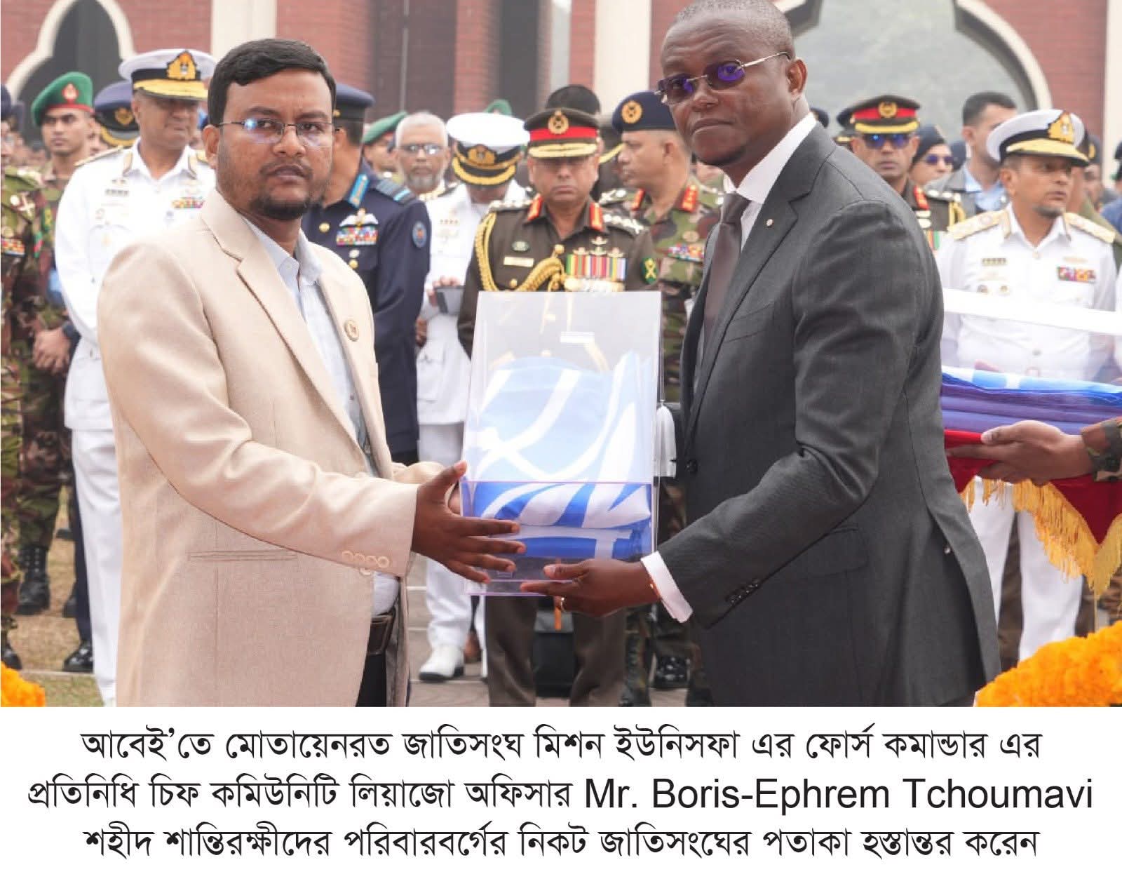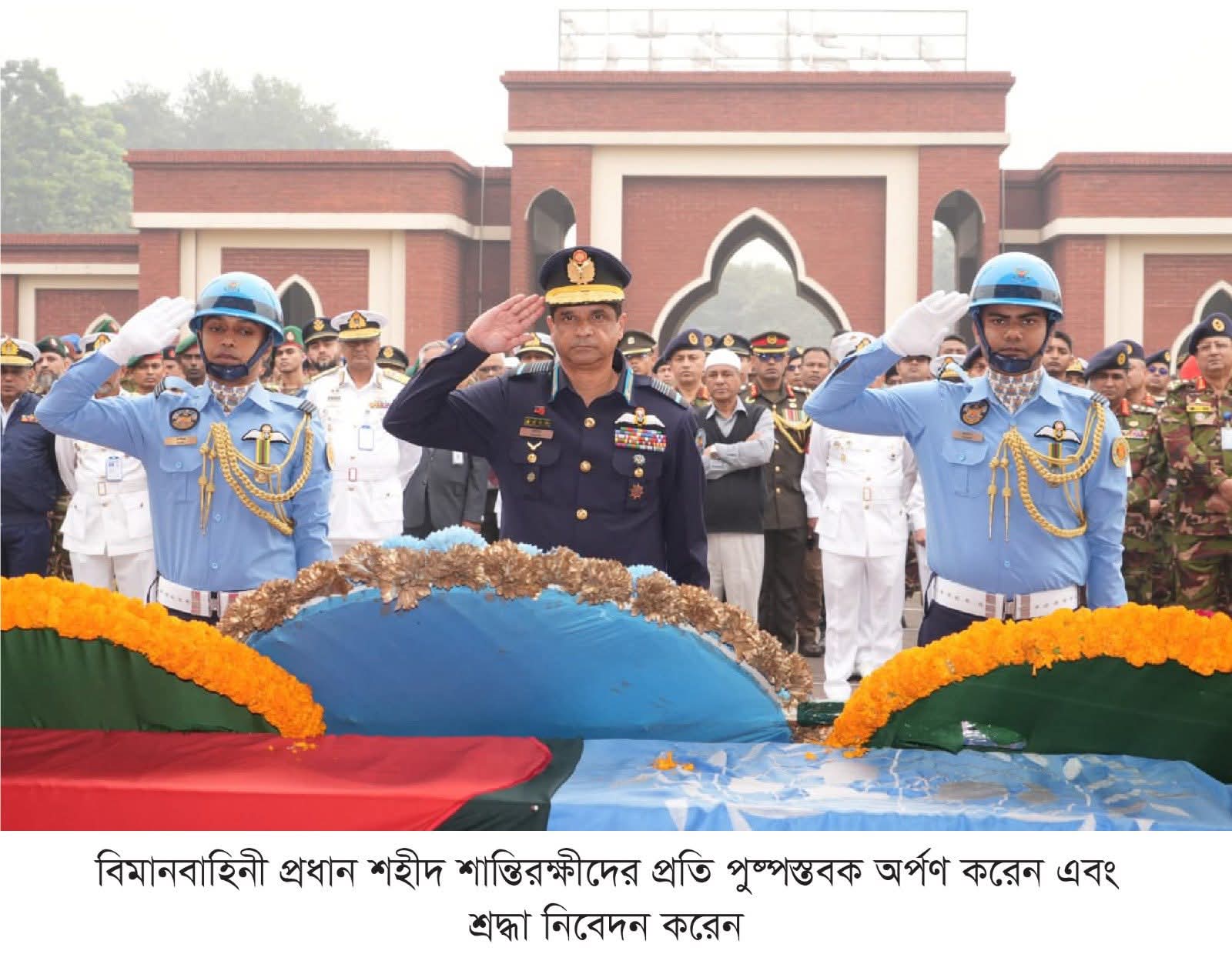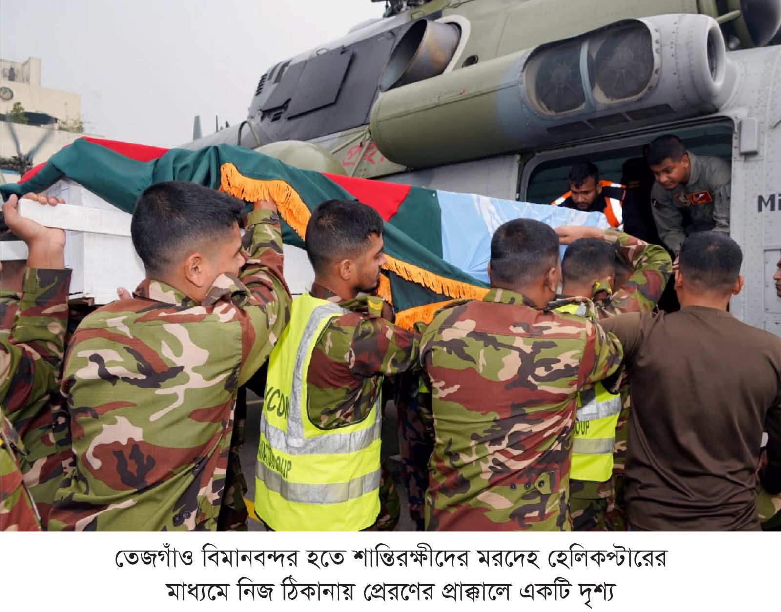 নামাজে জানাযায় মাননীয় স্বরাষ্ট্র উপদেষ্টা লেফটেন্যান্ট জেনারেল জাহাঙ্গীর আলম চৌধুরী (অবঃ), সেনাবাহিনী প্রধান জেনারেল ওয়াকার-উজ-জামান, এসবিপি, ওএসপি, এসজিপি, পিএসসি; নৌবাহিনী প্রধান এডমিরাল এম নাজমুল হাসান, ওএসপি, এনপিপি, এনডিসি, এনসিসি, পিএসসি; বিমান বাহিনী প্রধান এয়ার চীফ মার্শাল হাসান মাহমুদ খাঁন, বিবিপি, ওএসপি, জিইউপি, এনএসডব্লিউসি, পিএসসি; সামরিক-বেসামরিক বিভিন্ন পদবির কর্মকর্তা ও অন্যান্য পদবির সদস্যগণ এবং গণমাধ্যম ব্যক্তিবর্গ অংশগ্রহণ করেন। জানাযা অনুষ্ঠানের পূর্বে শাহাদাতবরণকারীদের জীবন বৃত্তান্ত পড়ে শোনানো হয় এবং তাঁদের নিকট আত্মীয়গণ বক্তব্য রাখেন। এরপর জাতিসংঘ মহাসচিব এর পক্ষে ইউনিসফা এর চিফ কমিউনিটি লিয়াজো অফিসার, Mr. Boris-Ephrem Tchoumavi বক্তব্য প্রদান করেন। জানাযা নামাজ শেষে তাঁদের প্রতি যথাযথ রাষ্ট্রীয় সম্মাননা প্রদান করা হয়। এ সময় মহামান্য রাষ্ট্রপতির পক্ষে তাঁর সামরিক সচিব, মাননীয় প্রধান উপদেষ্টার পক্ষে তাঁর সামরিক সচিব, সেনাবাহিনী প্রধান, নৌবাহিনী প্রধান এবং বিমান বাহিনী প্রধান শাহাদাতবরণকারীদের প্রতি শ্রদ্ধা নিবেদনের উদ্দেশ্যে পুষ্পস্তবক অর্পণ করেন। এরপর ইউনিসফা এর চিফ কমিউনিটি লিয়াজো অফিসার শাহাদাতবরণকারীদের নিকট আত্মীয়গণের কাছে জাতিসংঘ মহাসচিব এর পক্ষ থেকে জাতিসংঘের পতাকা হস্তান্তর করেন। আজ, তাঁদের নিজ নিজ এলাকায় (নাটোর, কুড়িগ্রাম, গাইবান্ধা, রাজবাড়ী এবং কিশোরগঞ্জ) হেলিকপ্টার (আবহাওয়া প্রতিকূল থাকলে সড়কপথে) এর মাধ্যমে মরদেহ প্রেরণ করতঃ যথাযথ রাষ্ট্রীয় মর্যাদায় তাঁদের দাফনকার্য সম্পন্ন করা হবে। যদিও এই গুরুতর ক্ষতি অপূরণীয়, তথাপি বাংলাদেশ সেনাবাহিনী এবং জাতিসংঘ সদর দপ্তর কর্তৃক শাহাদাতবরণকারীদের পরিবারের নিকট আর্থিক ক্ষতিপূরণ প্রদানের ব্যাপারে প্রয়োজনীয় কার্যক্রম প্রক্রিয়াধীন রয়েছে।এই ঘৃণ্য ড্রোন হামলার ব্যাপারে বাংলাদেশ সরকার এবং জাতিসংঘের ঊর্ধ্বতন কর্মকর্তাবৃন্দ ইতোপূর্বে তীব্র নিন্দা জানিয়েছেন। বাংলাদেশ সেনাবাহিনী কর্তৃক গভীর উদ্বেগ প্রকাশ পূর্বক জাতিসংঘ সদর দপ্তরে একটি আনুষ্ঠানিক প্রতিবাদ পত্র প্রেরণ করা হয়েছে এবং ইউনিসফাসহ সকল মিশন এলাকায় যথাশীঘ্র ড্রোন প্রতিরোধমূলক ব্যবস্থা গ্রহণের জন্য বলা হয়েছে।উল্লেখ্য, শান্তিরক্ষীদের মরদেহ গতকাল হযরত শাহজালাল আন্তর্জাতিক বিমানবন্দর ঢাকায় এমিরেটস এয়ারলাইন্সের একটি বিমানে দেশে প্রত্যাবর্তন করে। দেশে প্রত্যাবর্তনের পূর্বে আবেই’তে যথাযথ মর্যাদা এবং ভাবগাম্ভীর্যের সাথে শাহাদাতবরণকারী শান্তিরক্ষীদের জানাযা এবং সামরিক রীতি অনুযায়ী সম্মান প্রদর্শন করা হয়। উক্ত সন্ত্রাসী ড্রোন হামলায় ৬ জন শান্তিরক্ষী শহীদ হ