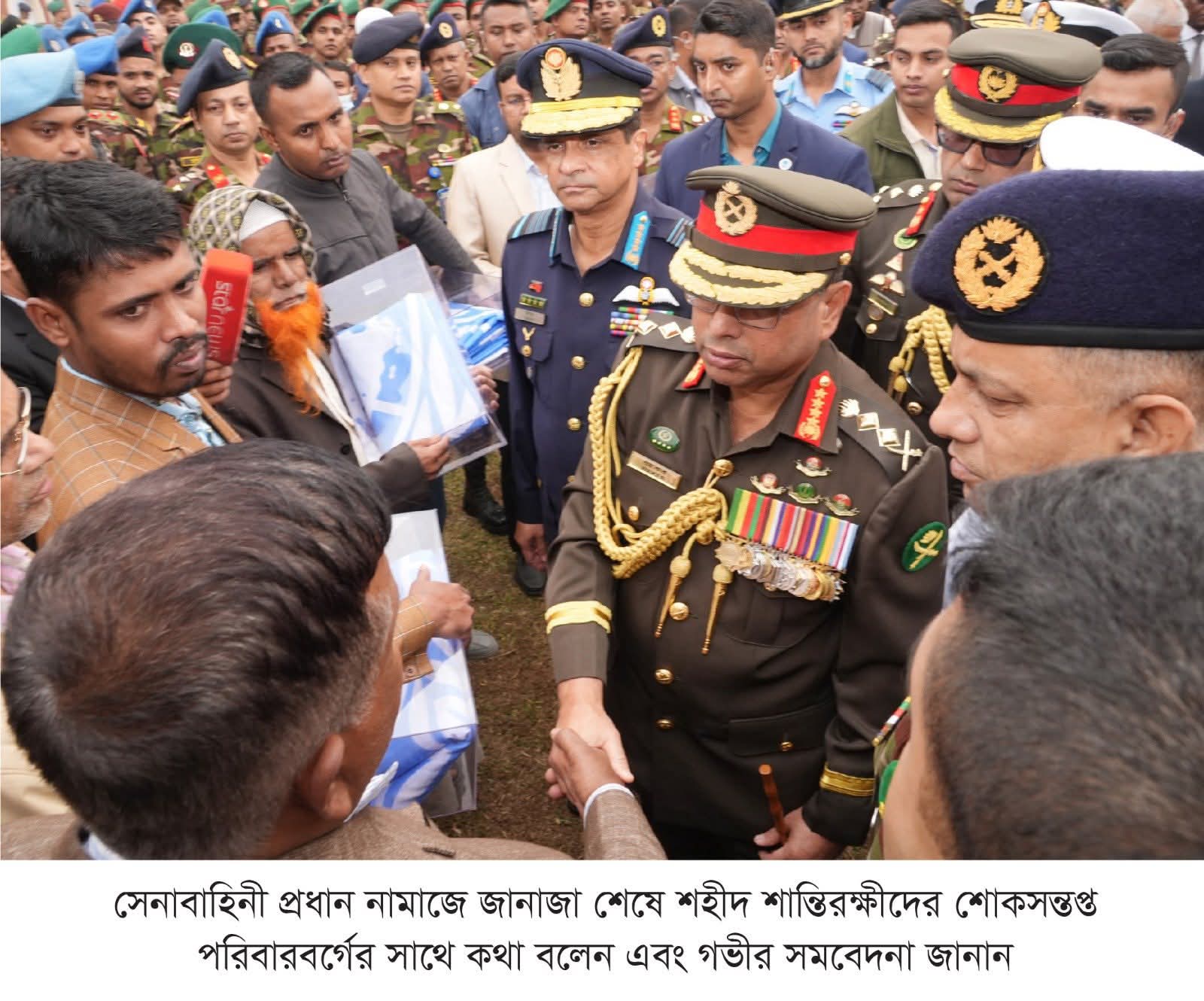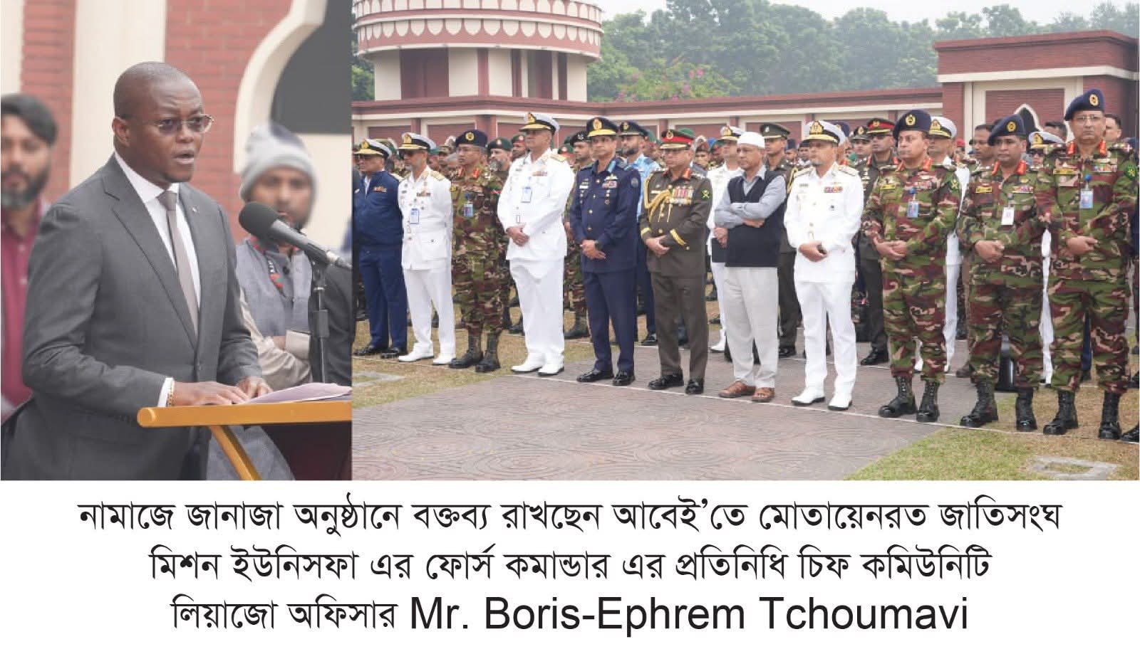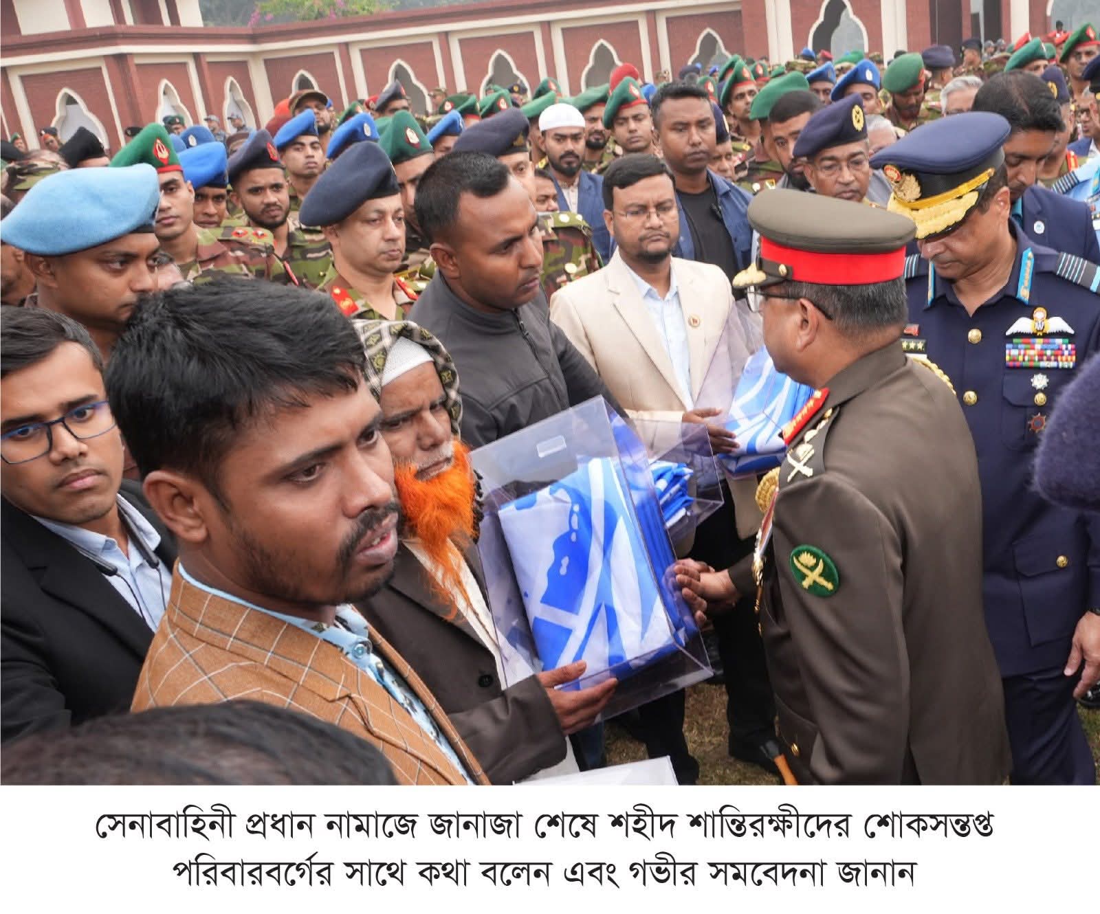 বাংলাদেশ সেনাবাহিনী’র ২১ ডিসেম্বর ২০২৫ইং (রবিবার): গত ১৩ ডিসেম্বর ২০২৫ তারিখে সুদানের আবেই এলাকায় জাতিসংঘ শান্তিরক্ষা মিশনের একটি ঘাঁটিতে সংঘটিত বর্বরোচিত সন্ত্রাসী ড্রোন হামলার ঘটনায় শাহাদাত বরণকারী ৬ জন শান্তিরক্ষীর নামাজে জানাযা আজ ঢাকা সেনানিবাসস্থ কেন্দ্রীয় মসজিদে অনুষ্ঠিত হয়।