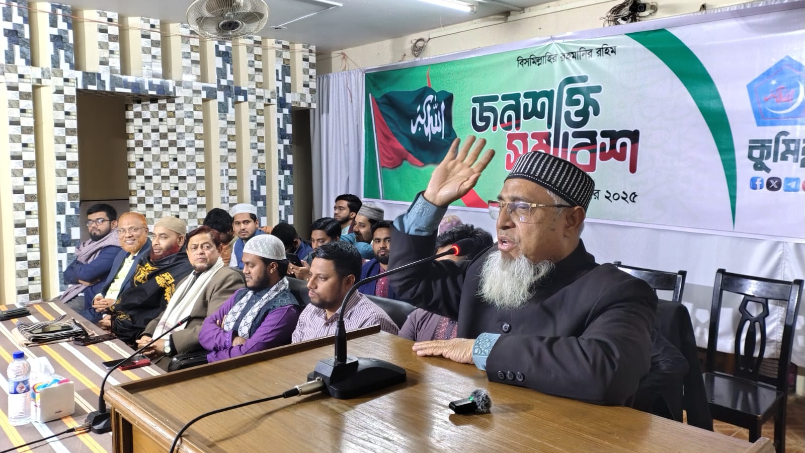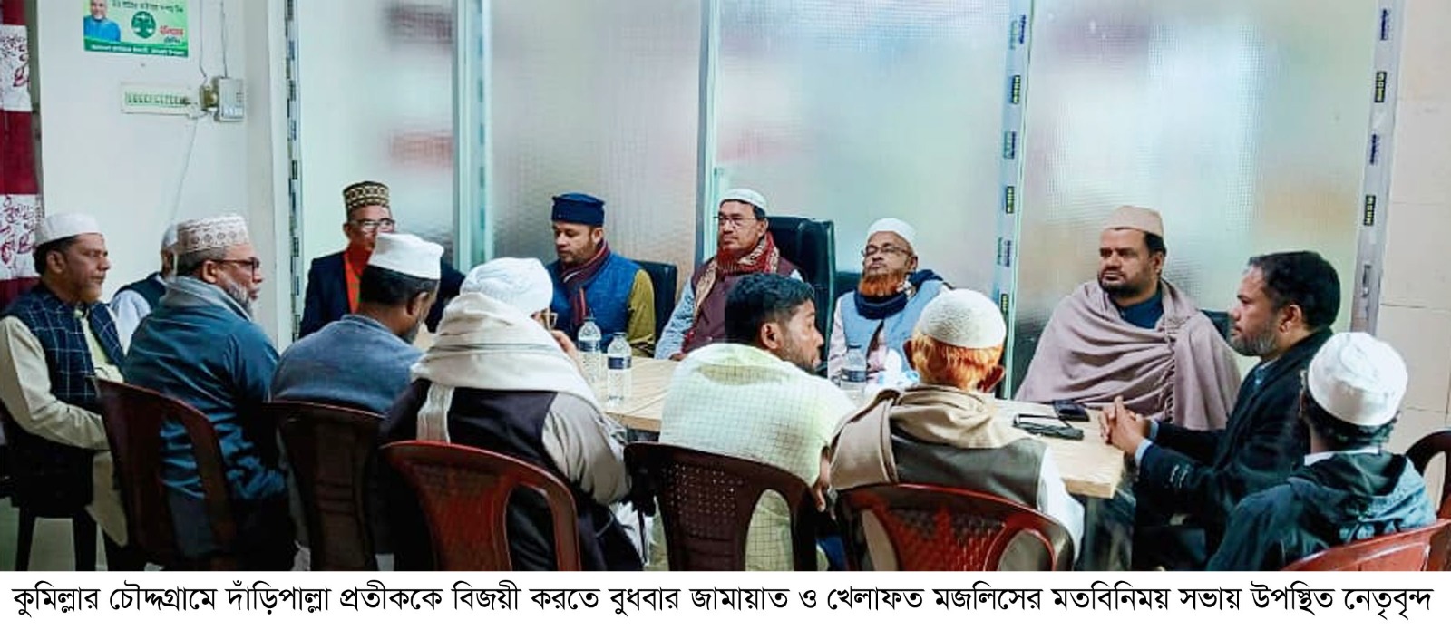 কুমিল্লা-১১ চৌদ্দগ্রাম আসনে দাঁড়িপাল্লা প্রতীককে বিজয়ী করতে জামায়াতের কেন্দ্রীয় নায়েবে আমীর ডাঃ সৈয়দ আবদুল্লাহ মোঃ তাহেরের পক্ষে কাজ করার লক্ষ্যে মতবিনিময় করেছে জামায়াতে ইসলামী ও খেলাফত মজলিসের নেতৃবৃন্দ। বুধবার খেলাফত মজলিসের উপজেলা সভাপতি মাওলানা শাহজালালের সভাপতিত্বে ও উপজেলা জামায়াত সেক্রেটারী বেলাল হোসাইনের পরিচালনায় চৌদ্দগ্রাম বাজাস্থ জামায়াত কার্যালয়ে আয়োজিত মতবিনিময় সভায় উপস্থিত ছিলেন জামায়াতের পক্ষে পৌর আমীর মাওলানা ইব্রাহিম, উপজেলার সাবেক আমীর আবু বক্কর ছিদ্দিক, মুক্তিযোদ্ধা আকতারুজ্জামান, উপজেলার সাবেক সেক্রেটারী শাহ মোঃ মিজানুর রহমান, কর্মপরিষদ সদস্য জয়নাল আবেদীন পাটোয়ারী, পৌর নায়েবে আমীর কাজী ইয়াছিন মজুমদার, সেক্রেটারী মোশারফ হোসেন ওপেল, ওলামা পরিষদের সভাপতি সাইয়েদ রাশীদুল হাসান জাহাঙ্গীর। খেলাফত মজলিসের পক্ষে উপজেলা সেক্রেটারী মোহাম্মদ মোস্তফা, প্রচার সম্পাদক মাওলানা মাসুদ, সহ-সভাপতি মাওলানা এমদাদ উল্লাহ, উপজেলা উত্তরের সেক্রেটারী মাওলানা নাছির উদ্দিন, সহ-সভাপতি মাওলানা মহিবুল্লাহ প্রমুখ।সভায় নেতৃবৃন্দ বলেন, ইসলামী দলগুলো একজোট হয়ে কাজ করছে এটা দেশের জন্য ভালো লক্ষণ। মানুষ দুর্নীতি ও চাঁদামুক্ত বাংলাদেশ চায়। ইসলামী জোটগুলো বিজয়ী হলে মানুষের সেই আশা পূরণ হবে। চৌদ্দগ্রামে ইসলামী জোটের একমাত্র প্রার্থী ডাঃ তাহেরের দাঁড়িপাল্লা প্রতীকের পক্ষে ঐক্যবদ্ধভাবে কাজ করবে জামায়াত ও খেলাফত মজলিস। নির্বাচনে জাতীয় নেতা ডাঃ তাহেরকে বিজয়ী করতে সর্বস্তরের নেতাকর্মী ও সাধারণ মানুষকে দাঁড়িপাল্লা প্রতীকে ভোট দেয়ার আহবান জানান নেতৃবৃন্দ।