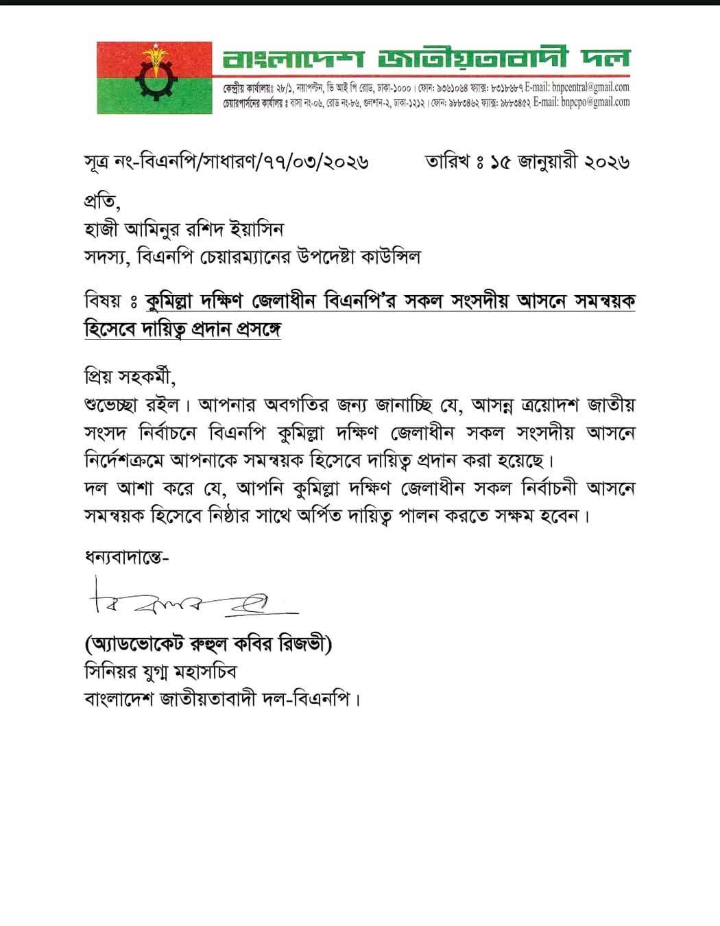 বিএনপির কেন্দ্রীয় কার্যালয় সূত্রে জানা যায়, আসন্ন ত্রয়োদশ জাতীয় সংসদ নির্বাচনকে সামনে রেখে দলীয় নির্দেশক্রমে এ দায়িত্ব প্রদান করা হয়েছে।