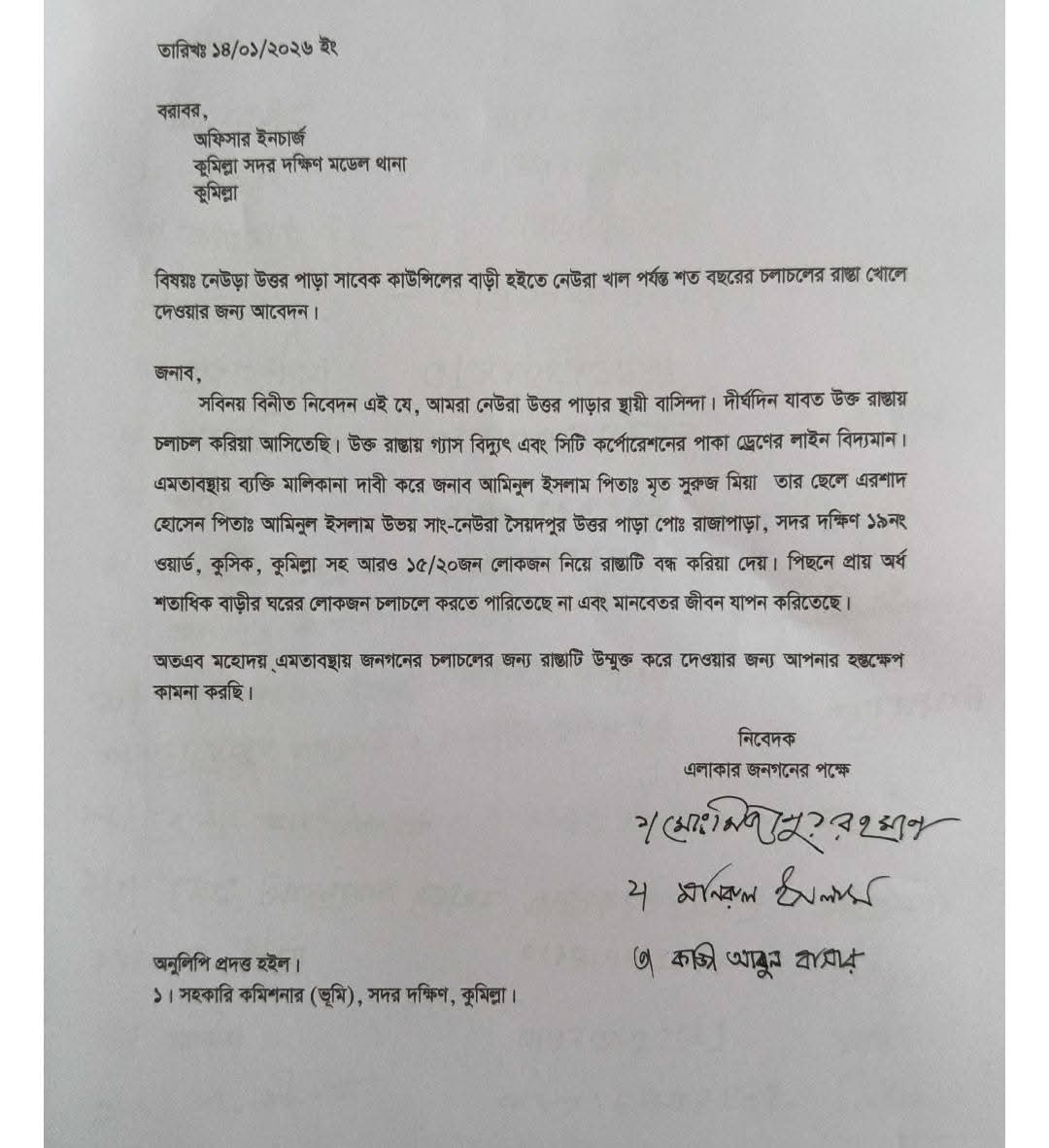 কুমিল্লা সদর দক্ষিণ উপজেলার নেউরা উত্তরপাড়ায় শতবর্ষ ধরে ব্যবহৃত একটি গুরুত্বপূর্ণ চলাচলের রাস্তা জোরপূর্বক বন্ধ করে দেওয়ার অভিযোগ উঠেছে। এ ঘটনায় ভুক্তভোগী এলাকাবাসী রাস্তা উন্মুক্ত করে দেওয়ার দাবিতে কুমিল্লা সদর দক্ষিণ মডেল থানার অফিসার ইনচার্জ (ওসি) বরাবর লিখিত আবেদন করেছেন।