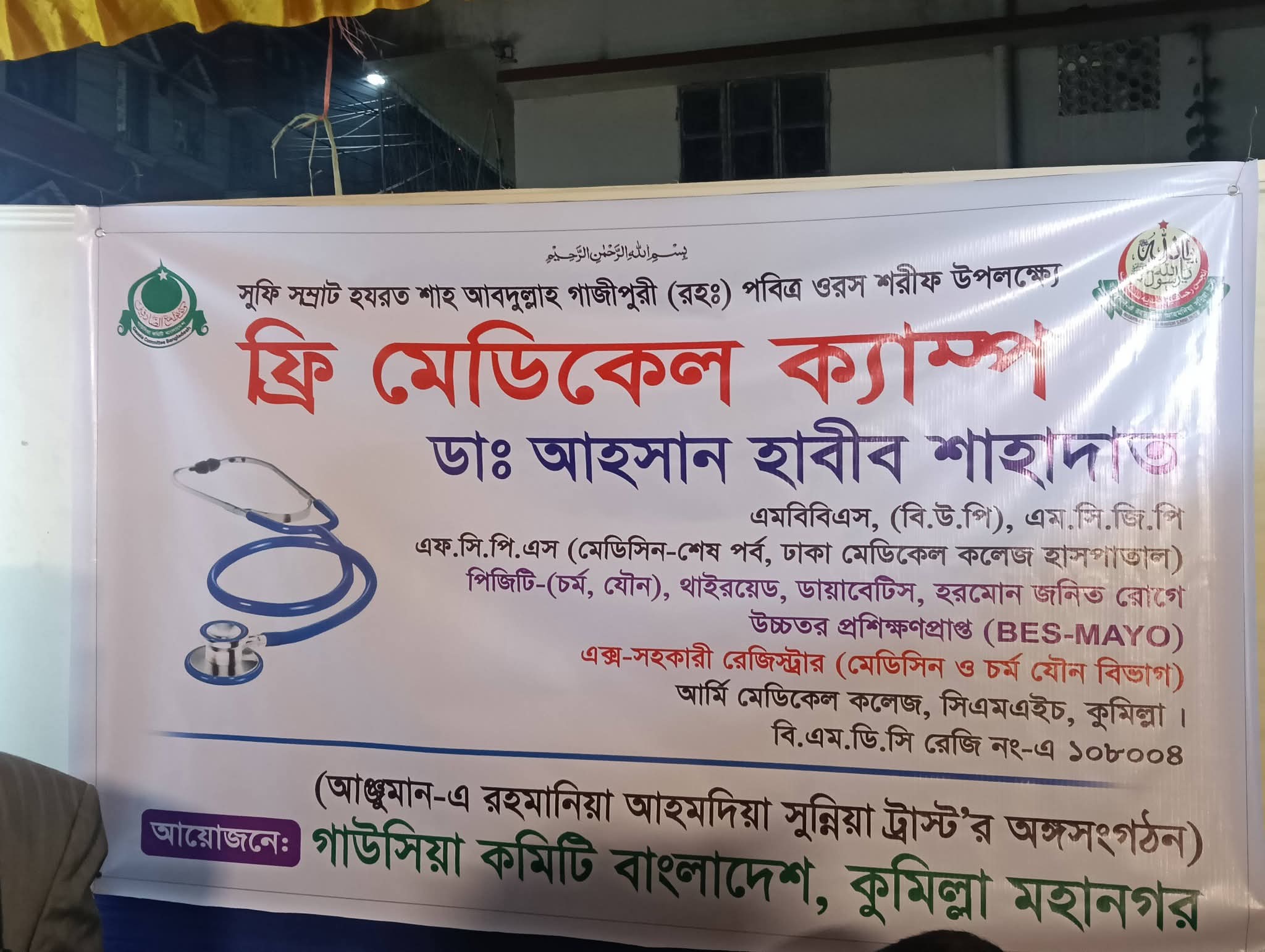 সুফি সম্রাট হযরত শাহ আবদুল্লাহ গাজীপুরী (রহঃ)-এর পবিত্র ওরস শরীফ উপলক্ষ্যে কুমিল্লায় এক ফ্রি মেডিকেল ক্যাম্পের আয়োজন করা হয়েছে।