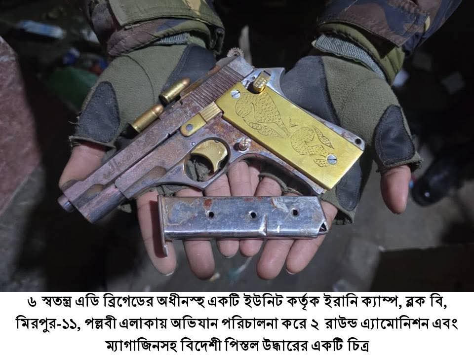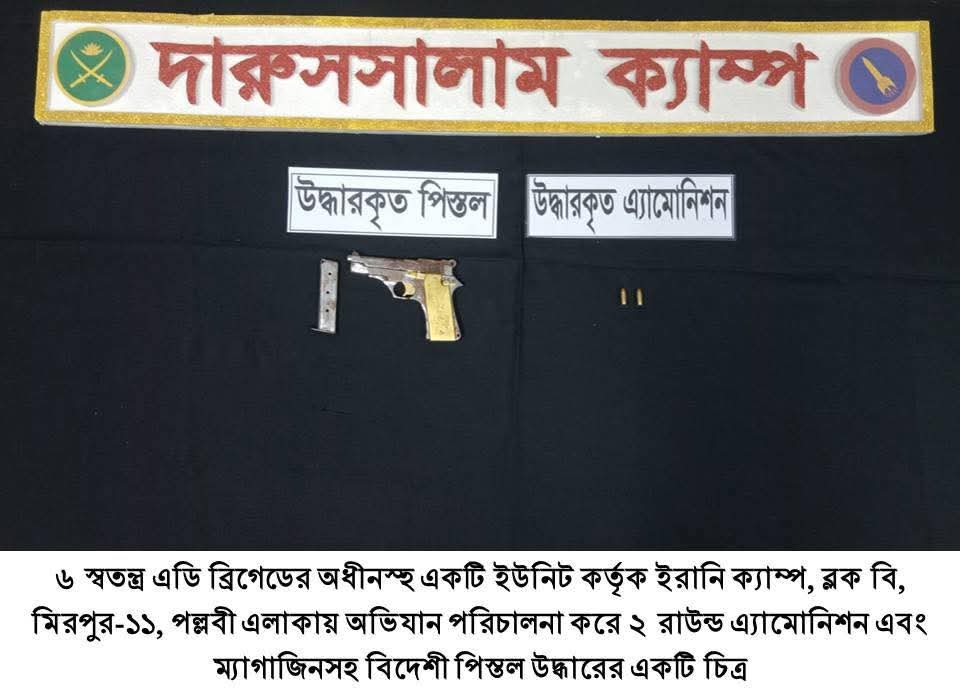 অন্যদিকে, গতকাল মধ্যরাতে রাজধানীর মিরপুর ১১ এলাকায় সুনির্দিষ্ট গোয়েন্দা তথ্যের ভিত্তিতে পৃথক একটি অভিযানে ১টি ৭.৬৫ মি:মি: বিদেশী পিস্তল, ১টি পিস্তল ম্যাগাজিন ও ২ রাউন্ড পিস্তলের গোলাবারুদ উদ্ধার করা হয়। বাংলাদেশ সেনাবাহিনী জননিরাপত্তা, আইনশৃঙ্খলা ও জাতীয় নিরাপত্তা রক্ষায় সর্বদা অঙ্গীকারবদ্ধ। সন্ত্রাস, নাশকতা ও অপরাধ দমনে এ ধরনের সমন্বিত অভিযান ভবিষ্যতেও অব্যাহত থাকবে।