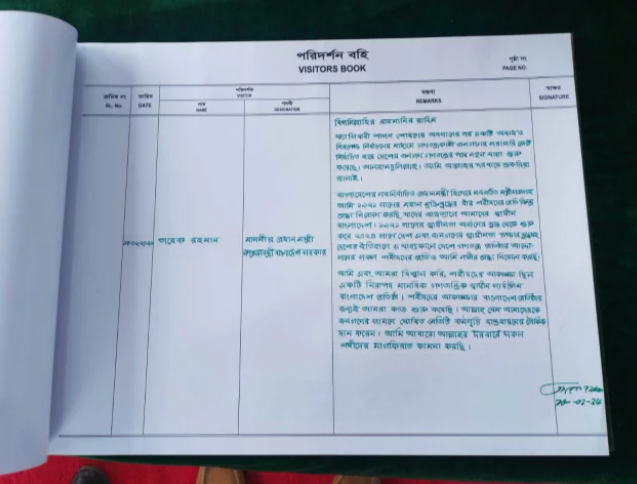 জাতীয় স্মৃতিসৌধে মহান মুক্তিযুদ্ধের শহীদদের প্রতি শ্রদ্ধা জানিয়ে পরিদর্শন বইয়ে সই করেছেন বাংলাদেশের ১১তম প্রধানমন্ত্রী ও বিএনপির চেয়ারম্যান তারেক রহমান। বুধবার (১৮ ফেব্রুয়ারি) বেলা ১১টায় স্মৃতিসৌধে মহান শহীদদের ফুলের শ্রদ্ধা নিবেদন শেষে স্মৃতিসৌধের পরিদর্শন বইয়ে সই করেন তিনি। পরিদর্শন বইয়ে তারিখের জায়গায় বাংলায় আজকের ১৮-২-২০২৬ তারিখ লেখেন তিনি। পদবীর জায়গায় লেখেন, মাননীয় প্রধানমন্ত্রী গণপ্রজাতন্ত্রী বাংলাদেশ সরকার। আর মন্তব্যের ঘরে লেখেন, ফ্যাসিবাদী শাসন শোষণের পর একটি অবাধ ও নিরপেক্ষ নির্বাচনের মাধ্যমে গণতন্ত্রকামী জনগণের সরাসরি ভোটে নির্বাচিত হয়ে দেশের জনগণ গণতন্ত্রের পথে নতুন যাত্রা শুরু করেছে।