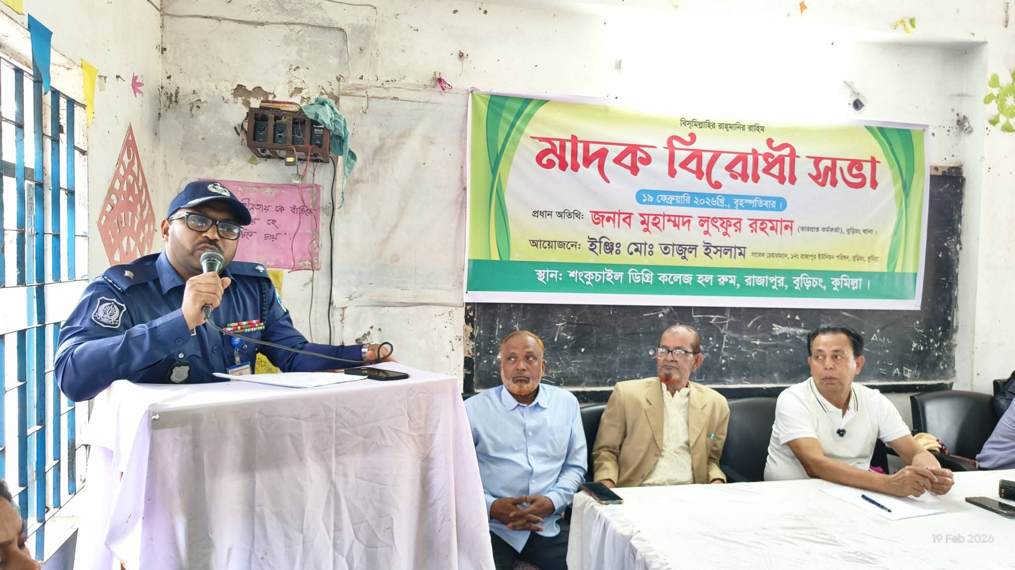 কুমিল্লা বুড়িচং থানাধীন এলাকায় মাদকবিরোধী সভা অনুষ্ঠিত।এসময় উক্ত সভায় উপস্থিতি থেকে বুড়িচং থানার ভারপ্রাপ্ত কর্মকর্তা (ওসি) লুৎফুর রহমান বলেছেন, তিনি যতদিন এই থানায় দায়িত্বে থাকবেন, ততদিন সিএনজি, অটোরিকশাসহ কোনো পরিবহন থেকে জিপির নামে চাঁদাবাজি কিংবা মাদক ব্যবসা করতে দেওয়া হবে না। চাঁদাবাজি, অবিচার ও জুলুম-নির্যাতনের সঙ্গে জড়িত কাউকে কোনোভাবেই ছাড় দেওয়া হবে না বলেও হুঁশিয়ারি দেন তিনি।বৃহস্পতিবার (১৯ ফেব্রুয়ারি) দুপুরে উপজেলার রাজাপুর ইউনিয়নের শংকুচাইল ডিগ্রি কলেজ হলরুমে আয়োজিত এক মাদকবিরোধী সভায় প্রধান অতিথির বক্তব্যে তিনি এসব কথা বলেন।ওসি লুৎফুর রহমান বলেন,