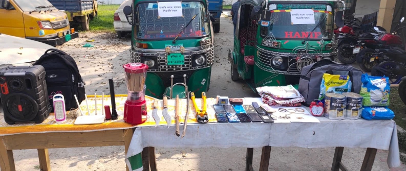 ৪। ৫টি সিটিগোল্ড এর চুরি, ০১টি সিটিগোল্ড এর বেসলাইট, ১২টি বিভিন্ন রংয়ের হাফ প্যান্ট ও মুখোশ, একটি ট্রাভেলস ব্যাগ,