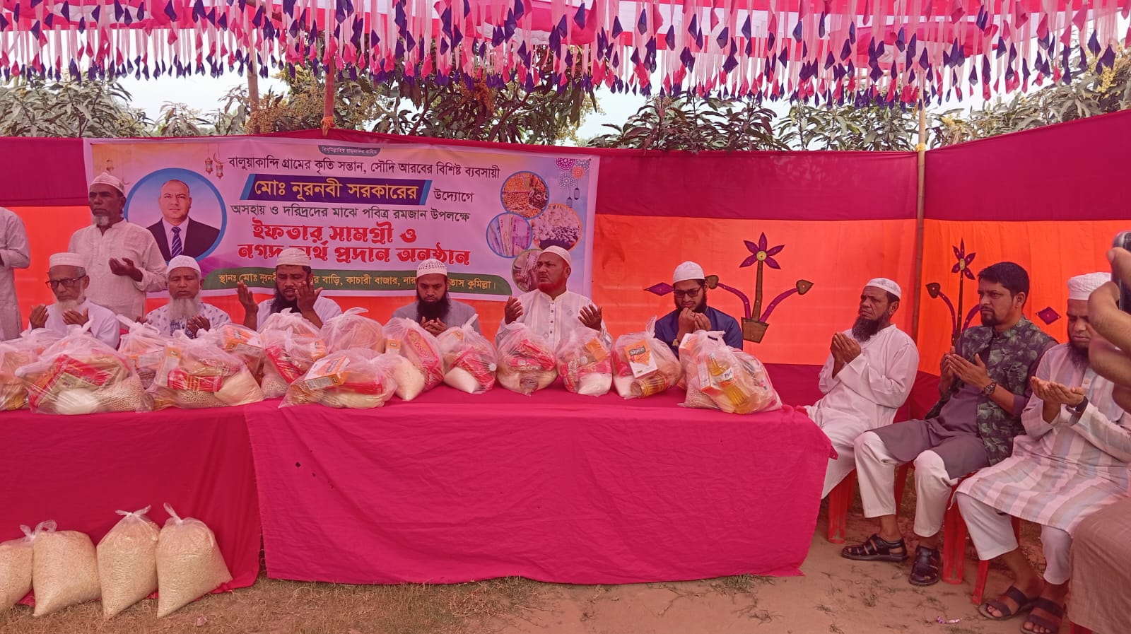 সোমবার (২ মার্চ) সকাল ১০ টায় নূরনবী সরকারের কাচারী বাজারস্থ বাড়িতে অসহায় ও দরিদ্রদের মাঝে পবিত্র রমজান উপলক্ষে এই ইফতার সামগ্রী ও নগদ অর্থ প্রদান করা হয়। দুঃখিয়ারকান্দি, নয়াকান্দি, সোনাকান্দা,ভাটিবন্দ, বালুয়াকান্দি, তাড়িয়াকান্দি, তুলাকান্দি, আসমানিয়া বাজার, দক্ষিণ নারান্দিয়া ও নারায়নপুরসহ বিভিন্ন গ্রামের প্রায় ৫০০ জন সাধারণ জনগণের মাঝে নগদ ৫০০ টাকা ও ইফতার সামগ্রী তুলে দেওয়া হয়।