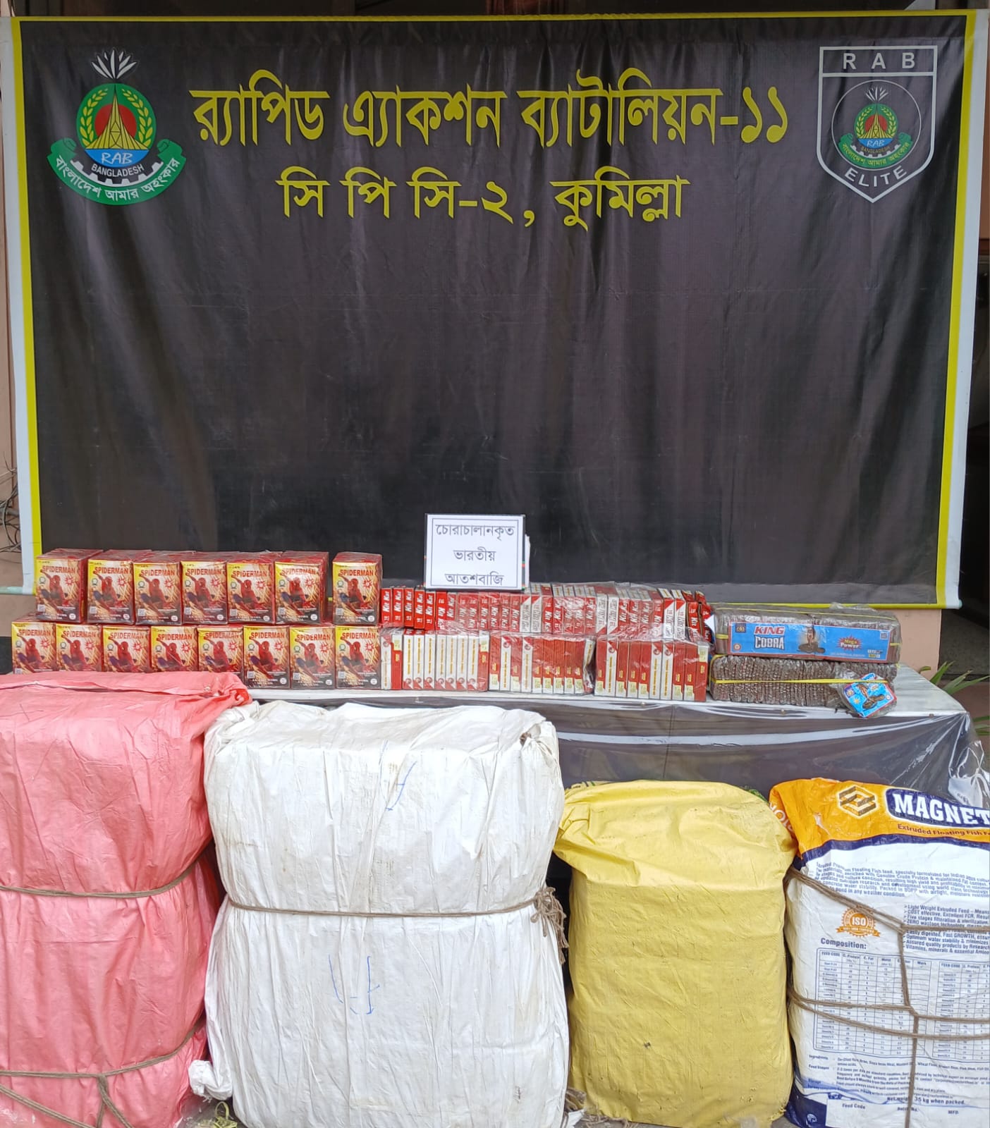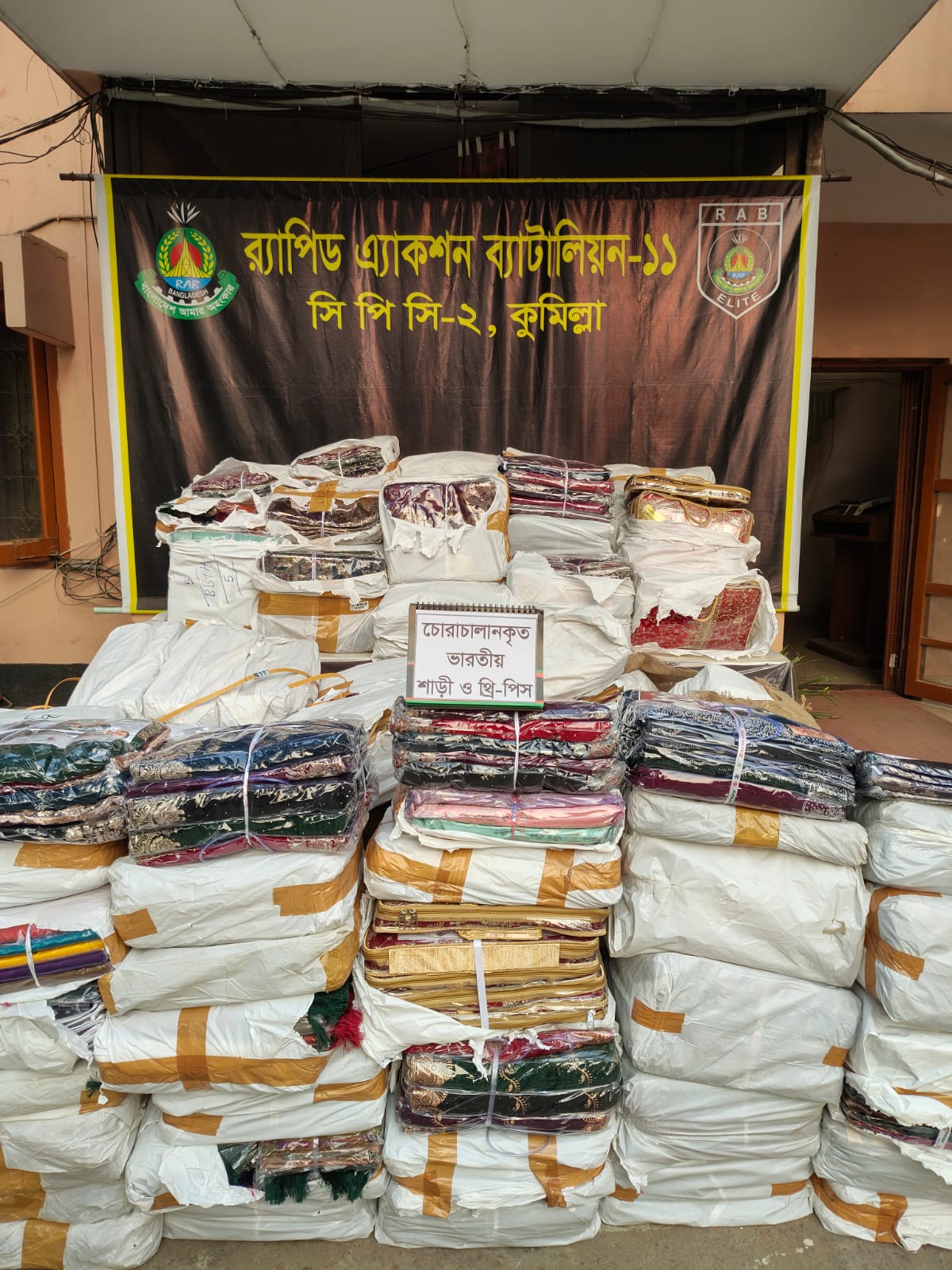 গত ০৭ মার্চ ২০২৬ ইং তারিখ বিকালে র্যাব-১১, সিপিসি-২ এর একটি বিশেষ আভিযানিক দল গোপন সংবাদের ভিত্তিতে কুমিল্লা জেলার চৌদ্দগ্রাম থানাধীন বাতিশা ইনিয়নের নানকরা এলাকায় চোরাচালার বিরোধী অভিযান পরিচালনা করে। অভিযানে মোঃ আরীফুর রহমান আহসান (৪২) নামক ০১ জন চোরাকারবারিকে গ্রেফতার করতে সক্ষম হয়। এ সময় আসামীর হেফাজত হতে ৮৬০ পিস ভারতীয় শাড়ি, ১০৮ পিস ভারতীয় থ্রি-পিস ও চোরাচালান কাজে ব্যবহৃত ০১টি ট্রাক জব্দ করা হয়। এছাড়াও পৃথক ০১টি অভিযানে ০৯ মার্চ ২০২৬ ইং তারিখ রাতে কুমিল্লা জেলার চৌদ্দগ্রাম থানাধীন আশরাফপুর এলাকায় অভিযান পরিচালনা করে ১,০৫,০০০ পিস আতশবাজি উদ্ধার করা হয়।